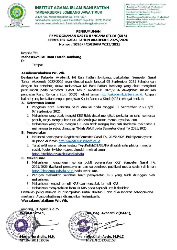 Berdasarkan Kalender Akademik IAI Bani Fattah Jombang, perkuliahan Semester Gasal Tahun Akademik 2025/2026 akan dimulai pada tanggal 08 September 2025 Sehubungan dengan hal tersebut, maka mahasiswa IAI Bani Fattah Jombang yang akan mengikuti perkuliahan pada Semester Gasal Tahun Akademik 2025/2026 diwajibkan melakukan pengisian Kartu Rencana Studi (KRS) melalui laman http://akademik.iaibafa.ac.id. Adapun hal-hal yang berkaitan dengan pengisian Kartu Rencana Studi (KRS) sebagai berikut: